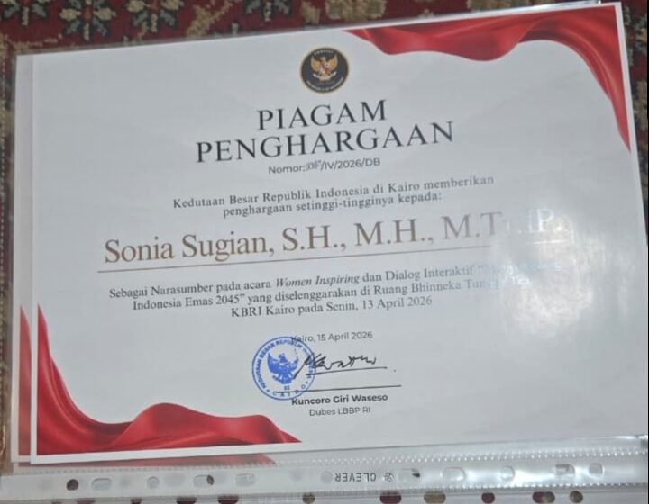 KAIRO, Narasi.id — Pengakuan internasional kembali diraih tokoh perempuan Indonesia. Sonia Sugian, SH., MH., M.tr.IP, menerima piagam penghargaan dari Kedutaan Besar Republik Indonesia di Kairo, atas kontribusinya sebagai narasumber dalam forum Himpunan Mahasiswa Jupiring dan Dialog Interaktif Indonesia Emas 2045.